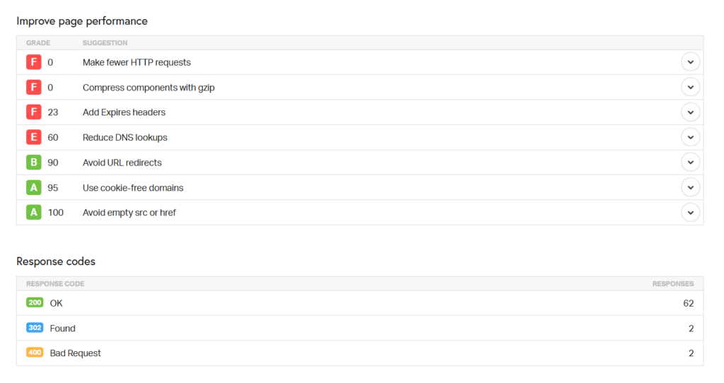 (Example of a page performance report)