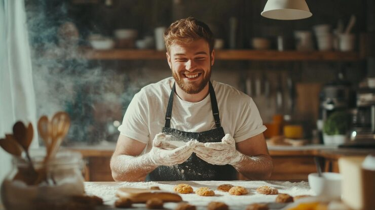 (Home baker preparing fresh snacks in a kitchen workspace)