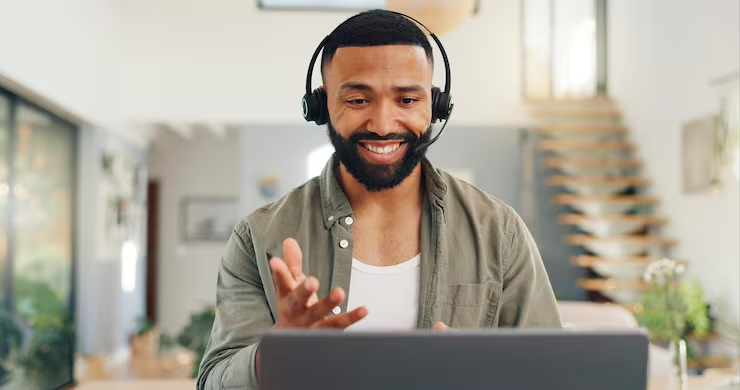 (Virtual assistant working remotely on a laptop while communicating with a client)