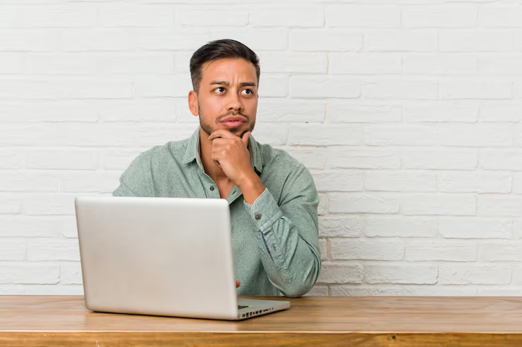 (Person sitting at a desk staring at a blank screen, representing procrastination and delayed ideas)